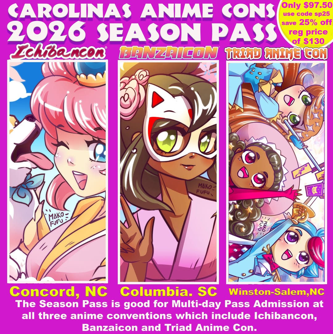 Get all weekend access to all three Carolinas Anime Cons Events for ONE Price! This season pass is good for all 2026 Carolina Anime Cons Events. Supplies are limited!